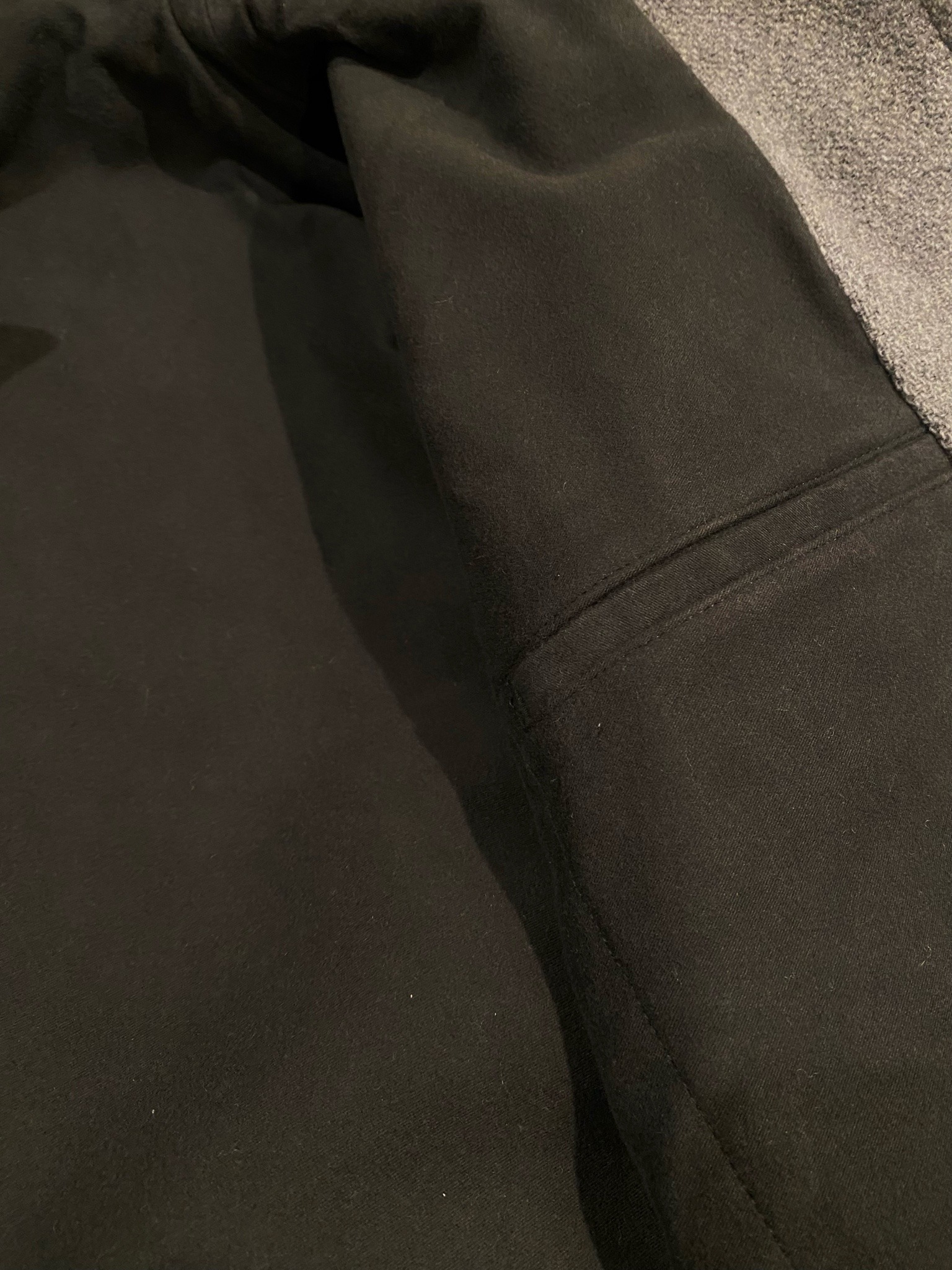 襟と裾帯はリブを配せずにメルトン共地で仕上げた懐かしくも新鮮なスタイリングで
