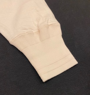 変わり編みの袖リブや絶妙の色味で合わせる前立ての杉綾テープなど