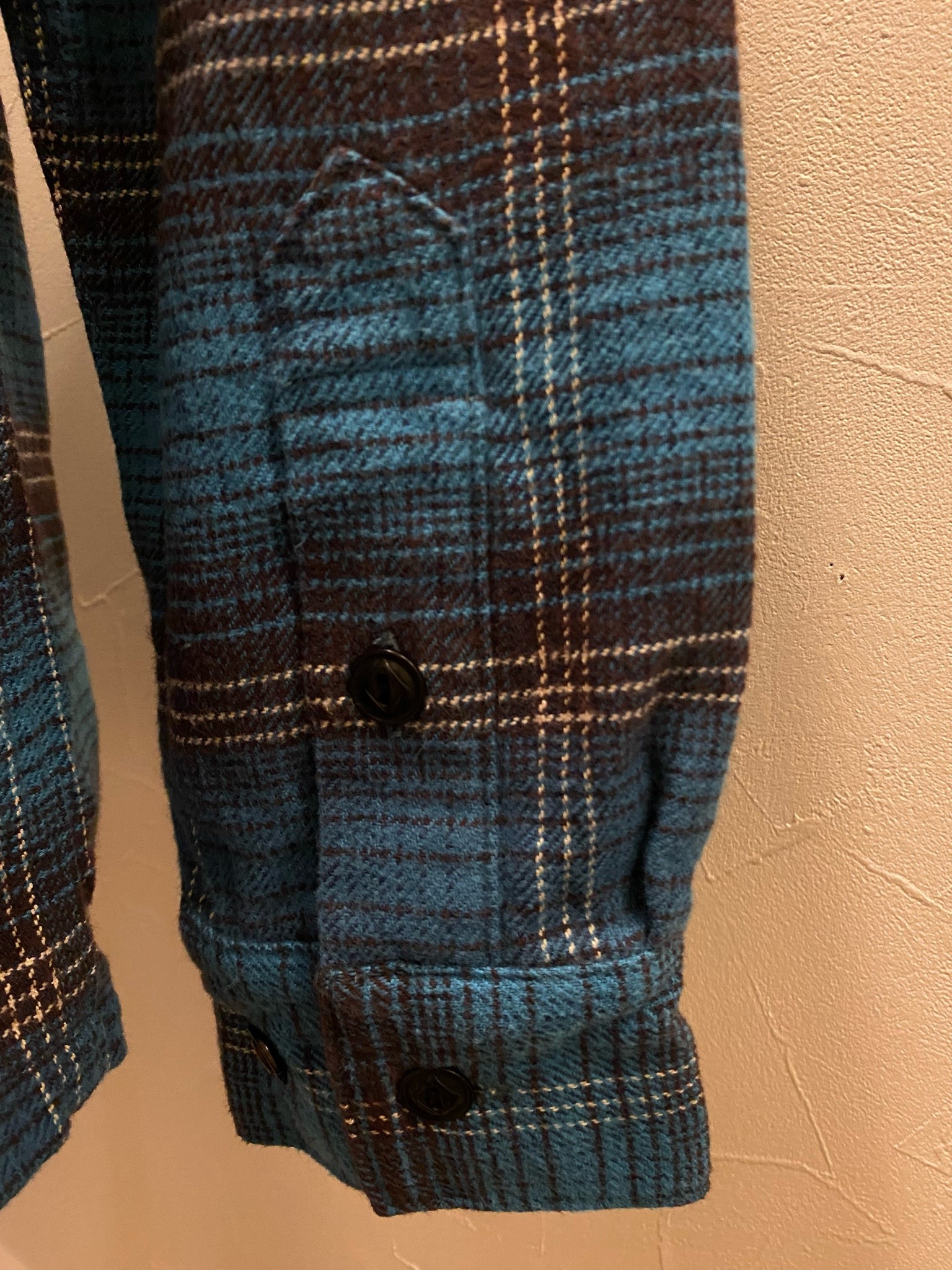 オープンカラーのスタイリングと共にポケットフラップ・カフス・ステッチワークといったディテールは