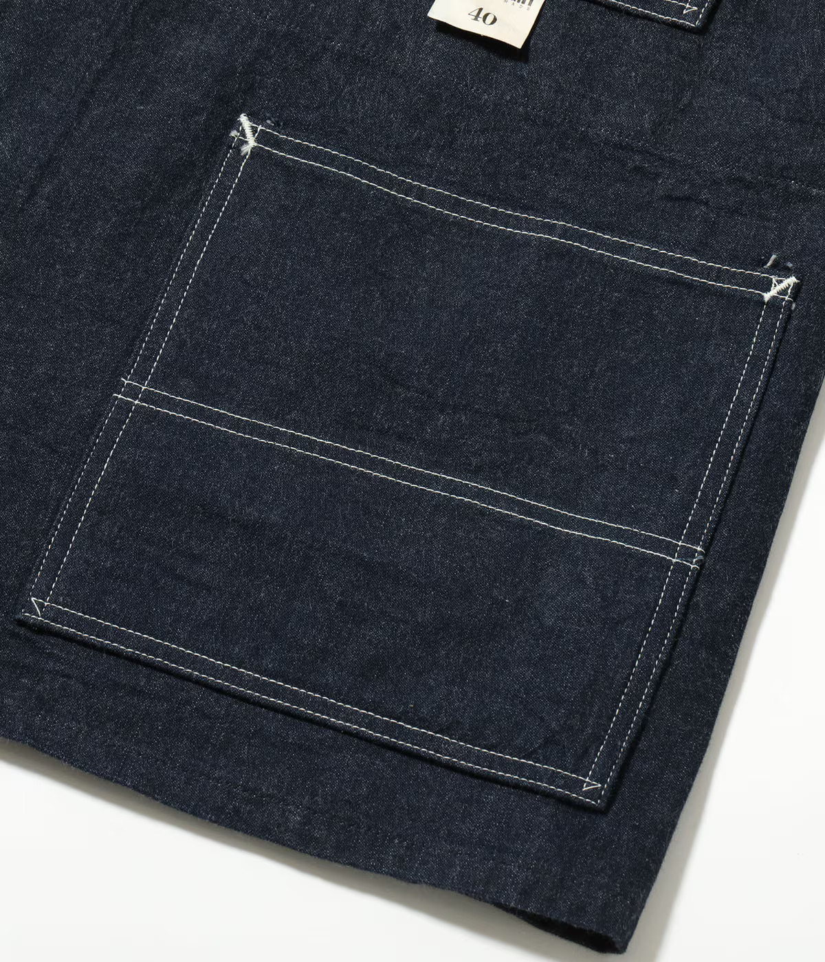 生地は緯糸がグレーのブルーデニム、襟は台襟が無いためボタンで閉じてもフィットするコンバーチブルカラー